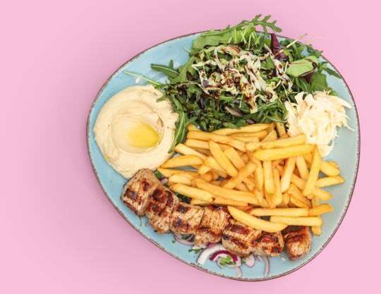 Veal with vegetables on skewers, salad, hummus, French fries.