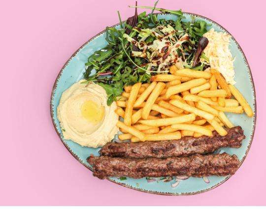 4 skewers Kafta, 4 skewers Taouk, 4 skewers Lahme, Taboulé, Baba Ghanouj, Hummus, French fries.